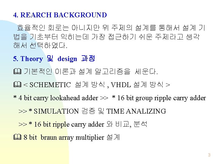 V H D L 설계 4 bit carry lookahead adder ( behavior modeling ) >> component >> 16 bit group ripple carry adder ( structure modeling ) >> simulation , time analize 16 bit ripple carry adder ( behavior modeling ) >> simulation, time analize 비교, 분석 23