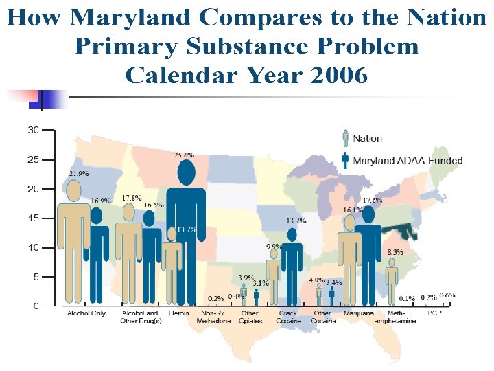 In Maryland FY 2005 n n n ~ 290, 000 Maryland adults need alcohol or drug treatment vs. 76, 538 admissions to treatment (~26%) Young adults 18 to 25 have the highest unmet need for alcohol and drug treatment in the state Estimated Costs Per Year Alcohol abuse > $3 billion Illicit drug abuse > $2 billion