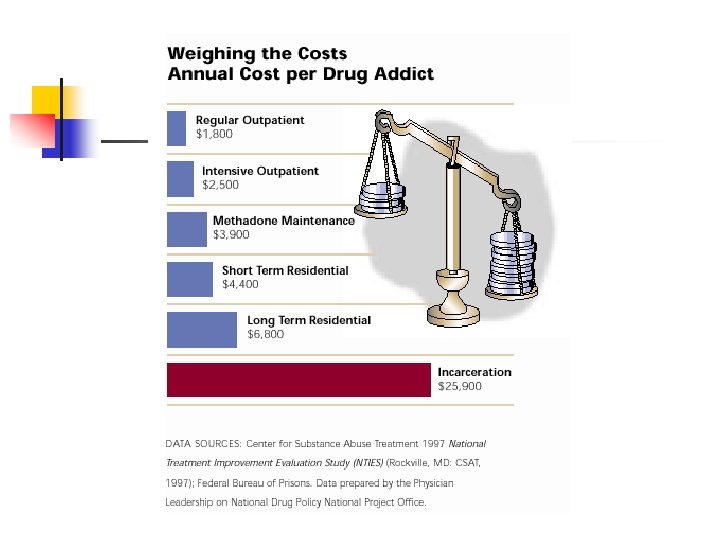 “Costly” or “Cost-Effective” n n Incarceration is Expensive Treatment is less expensive than not treating or incarceration 1 year of methadone maintenance = $3, 900 1 year of imprisonment = $25, 900 1: 7 Rule: Every $1 invested in treatment = up to $7 in reduced crime-related costs Health Offset: Savings can be > 1: 12 when health care costs are included Social and Personal Benefits Reduced interpersonal conflicts Improved workplace productivity Fewer drug-related accidents