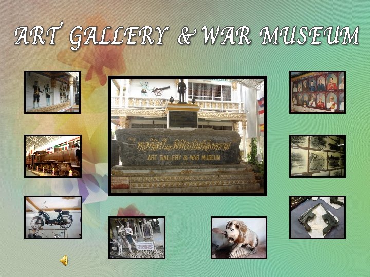 1. History of Thailand. It is about the wars between Thailand Burma in the form of mural paintings. There also other personal collections, such as pottery, herb pounders, guns, swords and coconut graters.