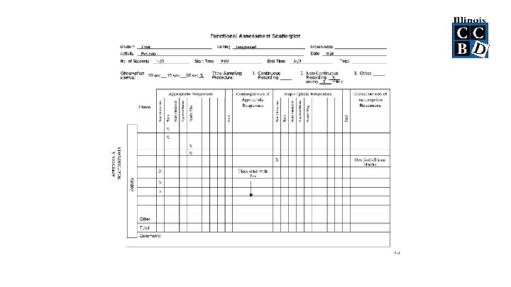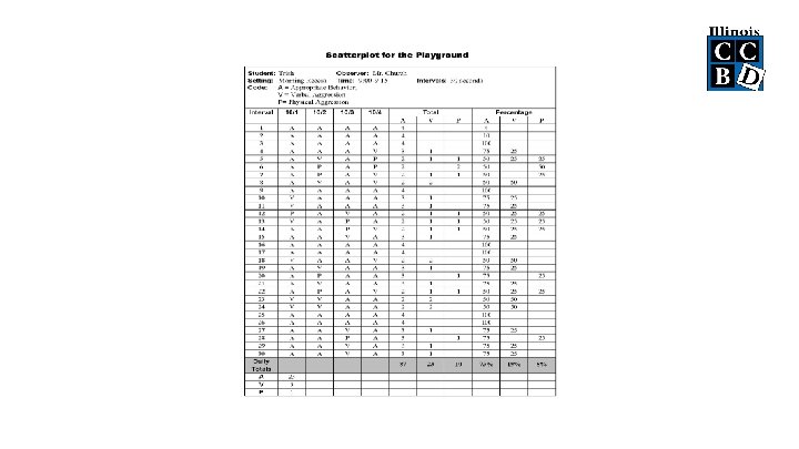 Data Collection • Data collection method must fit the behavior • Forms developed by team and all members collect data as needed • Data must be reviewed for progress monitoring – each day/week/grading period • Data must be reviewed annually with IEP, as well • Most often reviewed by special education teacher who serves as facilitator/liaison • Scatterplot graphs, ABC charts