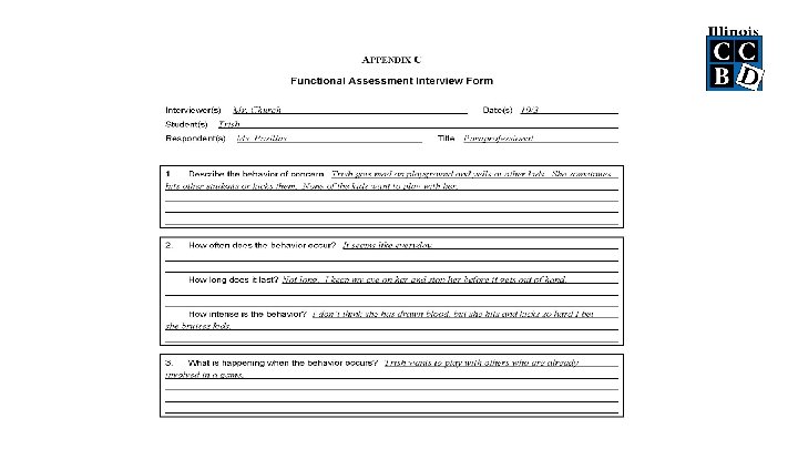 Trish (continued) At the meeting, Trish’s mother, Mrs. Waldo, explained that Trish was the same way with her brothers when she was at home. “They hit each other a lot. I yell at them, but they don’t listen to me. ” Mr. Church explained to the IEP team about functional behavioral assessment and suggested they do an assessment to find out more about why Trish was being physically aggressive. Mrs. Waldo was relieved, “I was so afraid you were going to tell me that she was going to be suspended or sent away to a different school. ” Mr. Church explained that Mrs. Waldo could help with the functional behavioral assessment, too. He explained that he would like to talk to her more about Trish’s behavior at home and he could give her some questions that she could ask Trish to help them with the functional behavior assessment.