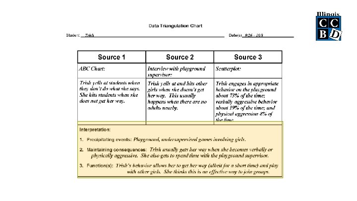 Trish (continued) After deciding what each person could do to contribute to the assessment, everyone agreed to meet again in two weeks to discuss his or her findings. Meanwhile, playground supervision would be increased to make sure that no one got hurt. Step 1: Describe the Behavior Trish is verbally and physically aggressive toward other students on the playground. (Adapted from the Center for Effective Collaboration and Practice, 2014)