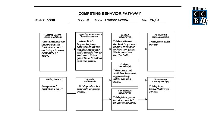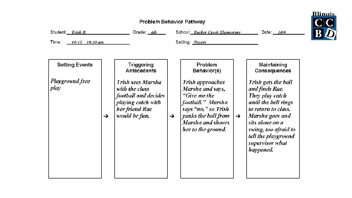 Trish (continued) After speaking with Ms. Osuna and Ms. Frey, Mr. Church realized that Trish’s behavior was significantly different from those of the other third graders on the playground, had been going on for some time, was possibly a danger to other students, and didn’t change when the usual interventions were tried. “I suggest we call a meeting of her IEP team and discuss conducting a functional behavioral assessment to try to determine what might be causing Trish to behave this way. I’ll ask the secretary to call Trish’s parents and set up a meeting time that would be convenient for them.