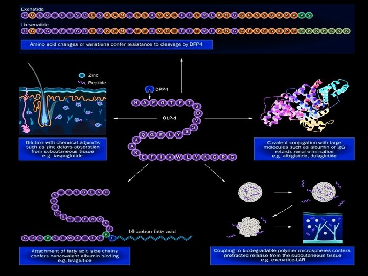 Rationale for GLP analoges 1, 2 GLP 1 (amidated form) 4 P DP GLP 1 has a 1 -4 min half-life (designed for grazing? ) EXENATIDE Resistant to DPP 4 plasma half-life of 2. 4 hours and an action time of about 6 -8 hours