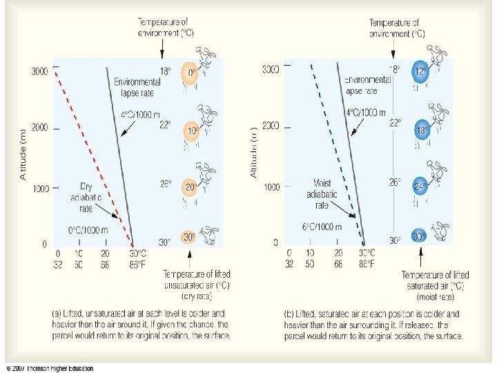 Real lapse rate, Γ > Γd What happens to air at ‘O’ that is displaced upwards by a disturbance? And what happens if it is displaced downwards? Real lapse rate, Γ is less than the DALR, Γd What happens to air at ‘O’ that is displaced upwards by a disturbance? And what happens if it is displaced downwards?