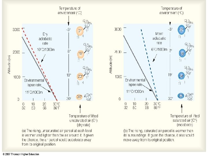 Adiabatic Lapse Rate • The First Law of Thermodynamics can be expressed as: d. U = dq + dw where d. U is the change in internal energy, dq is the heat supplied to the system, and dw is the work done on the system. • Raise a parcel of air there is no heat input, hence dq=0 (adiabatic) and dw=pd. V.