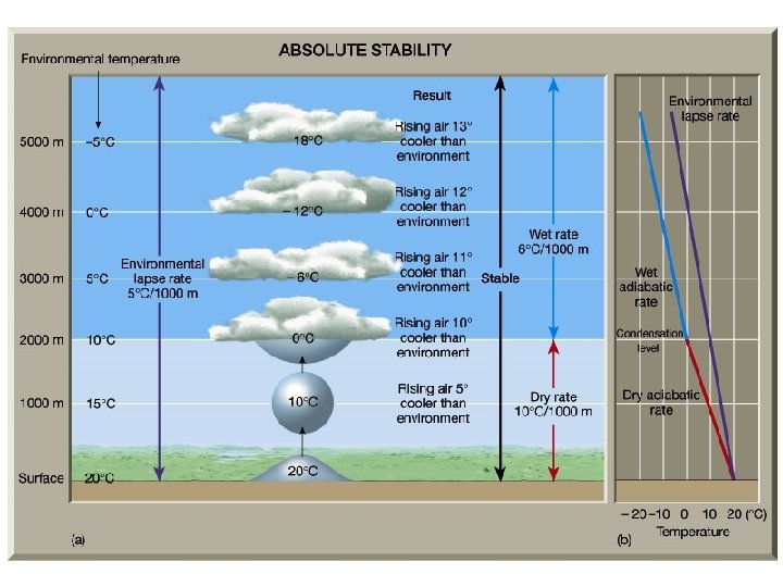Lapse Rates and Stability • Lapse rate is the rate at which the temperature decreases with altitude – the environmental lapse rate. • (Lapse rate is the negative of temperature gradient) • This should be compared with the dry adiabatic lapse rate of 10 ºC. • If the environmental lapse rate is less than 10 ºC, then the atmosphere is absolutely stable • If greater than 10 ºC, it is absolutely unstable