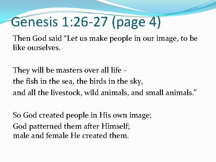 Genesis 1: 26 -27 (page 4) Then God said “Let us make people in our image, to be like ourselves. They will be masters over all life – the fish in the sea, the birds in the sky, and all the livestock, wild animals, and small animals. ” So God created people in His own image; God patterned them after Himself; male and female He created them.