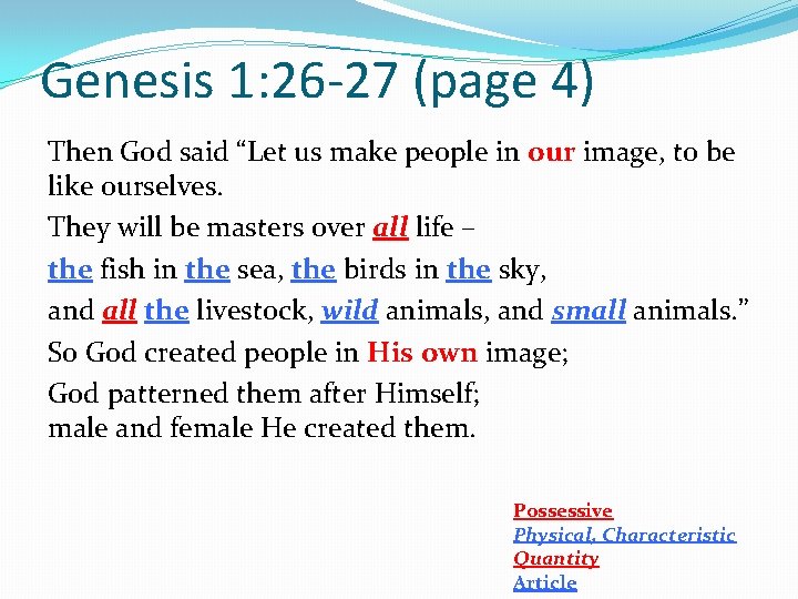 Genesis 1: 26 -27 (page 4) Then God said “Let us make people in our image, to be like ourselves. They will be masters over all life – the fish in the sea, the birds in the sky, and all the livestock, wild animals, and small animals. ” So God created people in His own image; God patterned them after Himself; male and female He created them. Possessive Physical, Characteristic Quantity Article