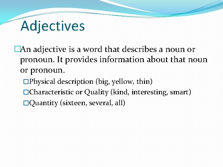 Adjectives �An adjective is a word that describes a noun or pronoun. It provides information about that noun or pronoun. �Physical description (big, yellow, thin) �Characteristic or Quality (kind, interesting, smart) �Quantity (sixteen, several, all)