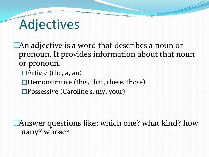 Adjectives �An adjective is a word that describes a noun or pronoun. It provides information about that noun or pronoun. �Article (the, a, an) �Demonstrative (this, that, these, those) �Possessive (Caroline’s, my, your) �Answer questions like: which one? what kind? how many? whose?