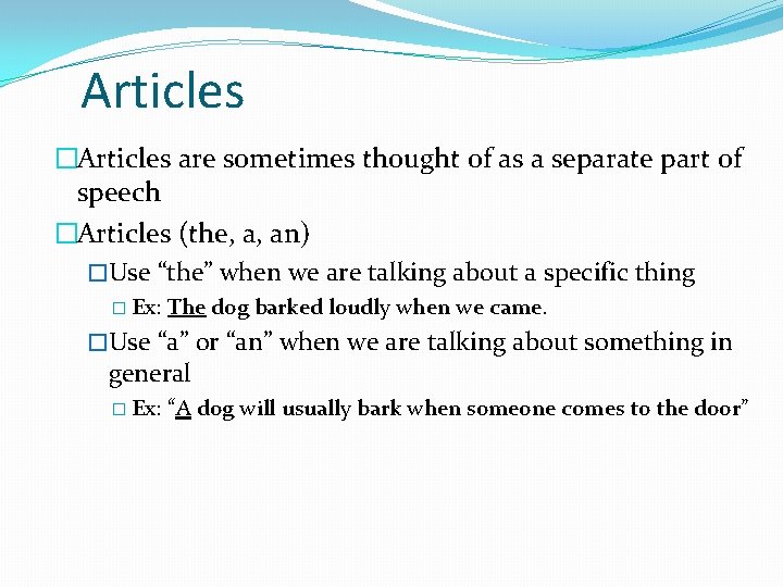 Articles �Articles are sometimes thought of as a separate part of speech �Articles (the, a, an) �Use “the” when we are talking about a specific thing � Ex: The dog barked loudly when we came. �Use “a” or “an” when we are talking about something in general � Ex: “A dog will usually bark when someone comes to the door”
