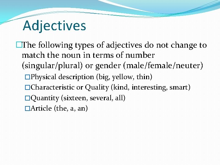 Adjectives �The following types of adjectives do not change to match the noun in terms of number (singular/plural) or gender (male/female/neuter) �Physical description (big, yellow, thin) �Characteristic or Quality (kind, interesting, smart) �Quantity (sixteen, several, all) �Article (the, a, an)