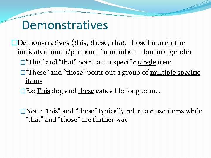 Demonstratives �Demonstratives (this, these, that, those) match the indicated noun/pronoun in number – but not gender �“This” and “that” point out a specific single item �“These” and “those” point out a group of multiple specific items �Ex: This dog and these cats all belong to me. �Note: “this” and “these” typically refer to close items while “that” and “those” are further way
