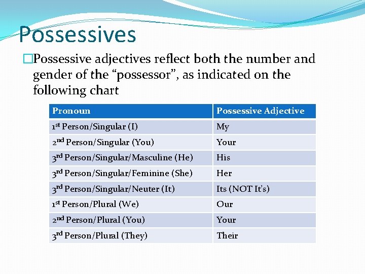 Possessives �Possessive adjectives reflect both the number and gender of the “possessor”, as indicated on the following chart Pronoun Possessive Adjective 1 st Person/Singular (I) My 2 nd Person/Singular (You) Your 3 rd Person/Singular/Masculine (He) His 3 rd Person/Singular/Feminine (She) Her 3 rd Person/Singular/Neuter (It) Its (NOT It’s) 1 st Person/Plural (We) Our 2 nd Person/Plural (You) Your 3 rd Person/Plural (They) Their