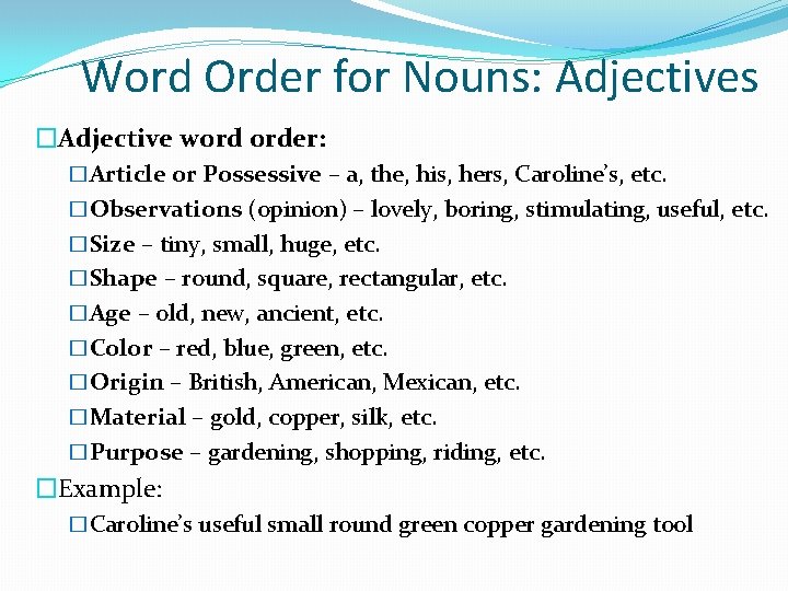 Word Order for Nouns: Adjectives �Adjective word order: �Article or Possessive – a, the, his, hers, Caroline’s, etc. �Observations (opinion) – lovely, boring, stimulating, useful, etc. �Size – tiny, small, huge, etc. �Shape – round, square, rectangular, etc. �Age – old, new, ancient, etc. �Color – red, blue, green, etc. �Origin – British, American, Mexican, etc. �Material – gold, copper, silk, etc. �Purpose – gardening, shopping, riding, etc. �Example: �Caroline’s useful small round green copper gardening tool