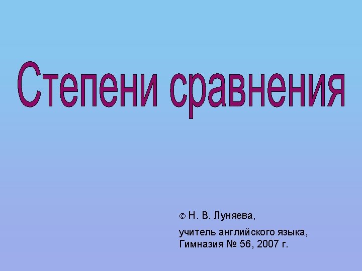 The book/the newspaper/the magazine (interesting) The newspaper is interesting. The magazine is more interesting than the newspaper. The book is the most interesting of all. 1. English/Russian/Chinese (difficult) 2. autumn/winter/summer (a beautiful season) 3. New Year’ Day/Christmas/birthday (a wonderful season) 4. tigers/wolves/snakes (dangerous animals) 5. The car/the flat/the TV set (expensive)