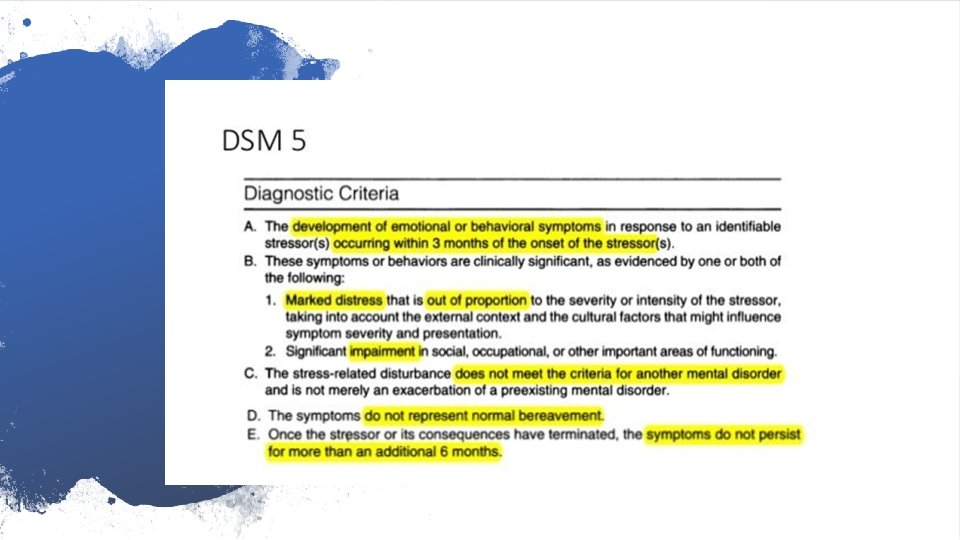 • Adjustment disorder is characterized by: increased anxiety, depressive symptoms, and/or disruptive behavior (eg, agitation, property destruction) that develops within 3 months of an identifiable stressor and lasts no more than 6 months after the stressor ends. • the stressful event is not life threatening (ex: divorce, termination of a romantic relationship, going to school, fail to meet goals , retiring. . ) • Symptoms in an adjustment disorder must be distressing and impairing.