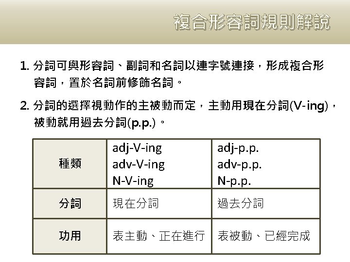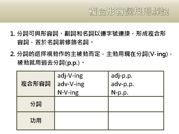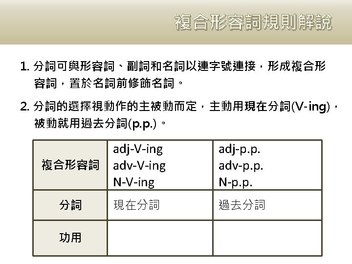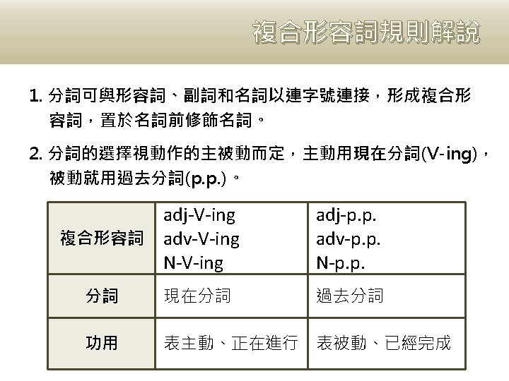 adv-V-ing a hard-working maid = a maid who works hard 努力 作的女僕 a slowly-flowing river = a river which flows slowly 緩慢流動的河流