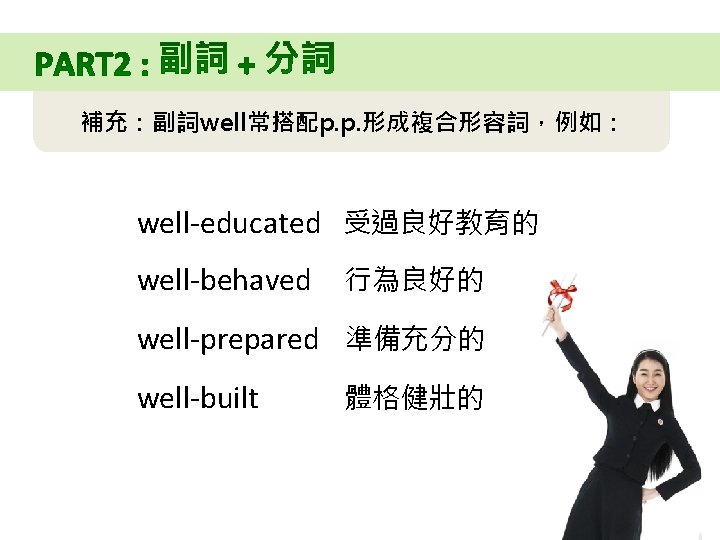adv-p. p. a cleverly-designed necklace = a necklace which is cleverly designed 設計精巧的項鍊 a well-known book = a book which is well known 一本有名的書 a well-done assignment = an assignment which is done well 做得很好的作業