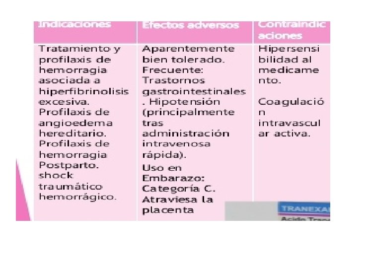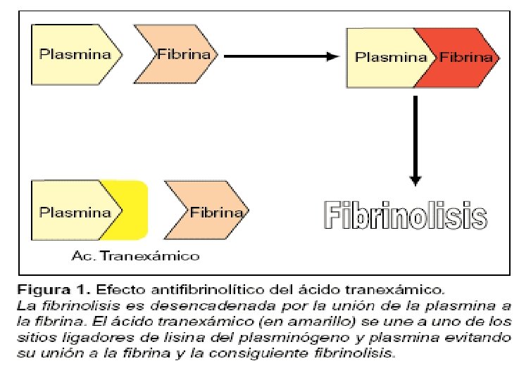 ÁCIDO TRANEXAMICO El ácido tranexámico es un inhibidor de la fibrinólisis que se utiliza para controlar la hemostasia cuando la fibrinólisis contribuye al sangrado. Lo que en definitiva inhibe la disolución de los coágulos (fibrinólisis).