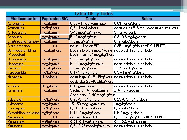 Drogas mas estables en SG 5% (comprobar estabilidad con labororio) Consideraciones Realizar cambio de DVA cada 24 horas Utilizar bombas de jeringas para su administración Evitar subir o bajar de nivel BIC en pacientes hemodinamicantes inestables frente a traslados Realizar traslape de acuerdo a políticas locales Uso de llaves de tres pasos