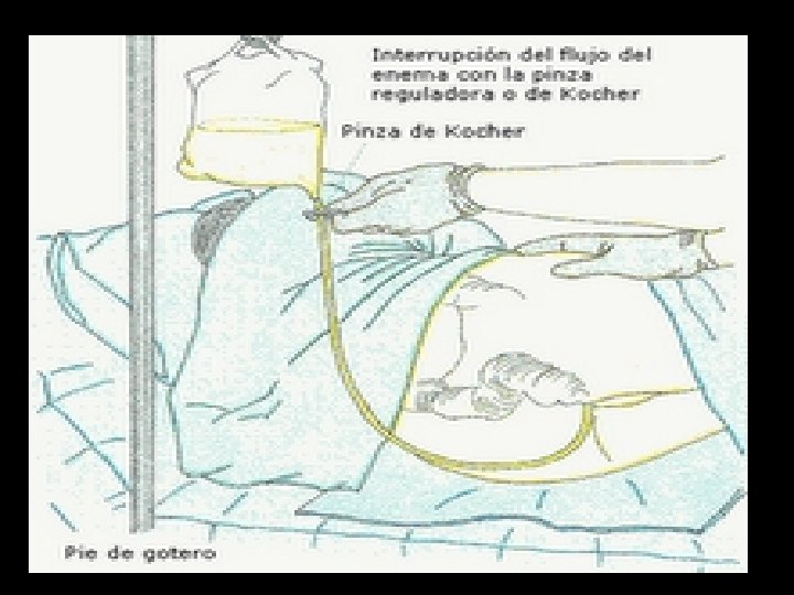 PROCEDIMIENTO: ØInformar del procedimiento al paciente de la técnica a realizar. ØProporcionar intimidad. ØLavar manos y poner guantes estériles. ØColocar al paciente en posición de Sims (decúbito lateral izquierdo con pierna derecha flexionada por encima de la izquierda), siempre que sea posible. ØLubricar el extremo distal de la sonda e introducirla sin forzar por el ano unos 10 cm. ØAdministrar lentamente la solución que el paciente tolere sin molestias. Suspender la administración ante cualquier incidencia dolor, hemorragia, retirar la sonda.