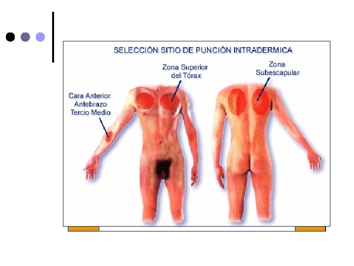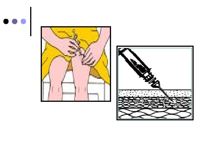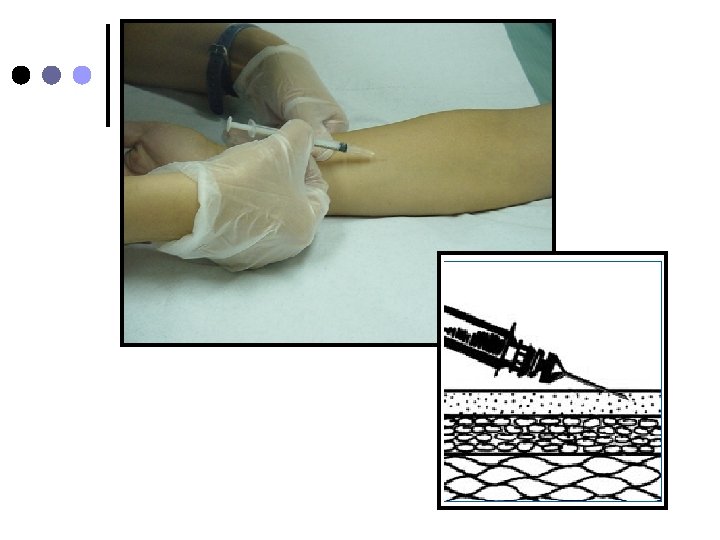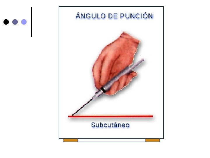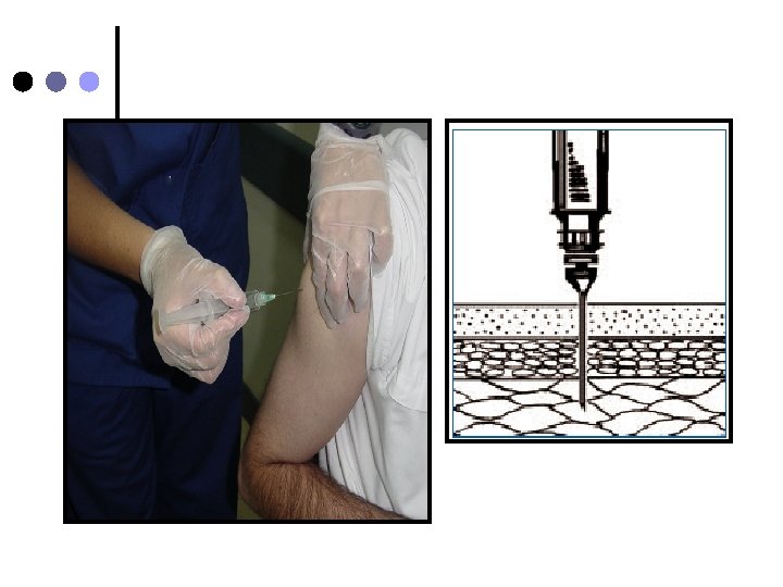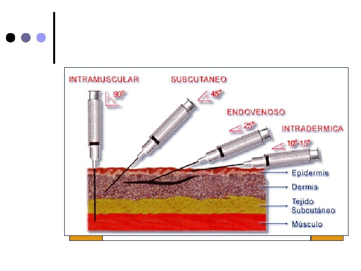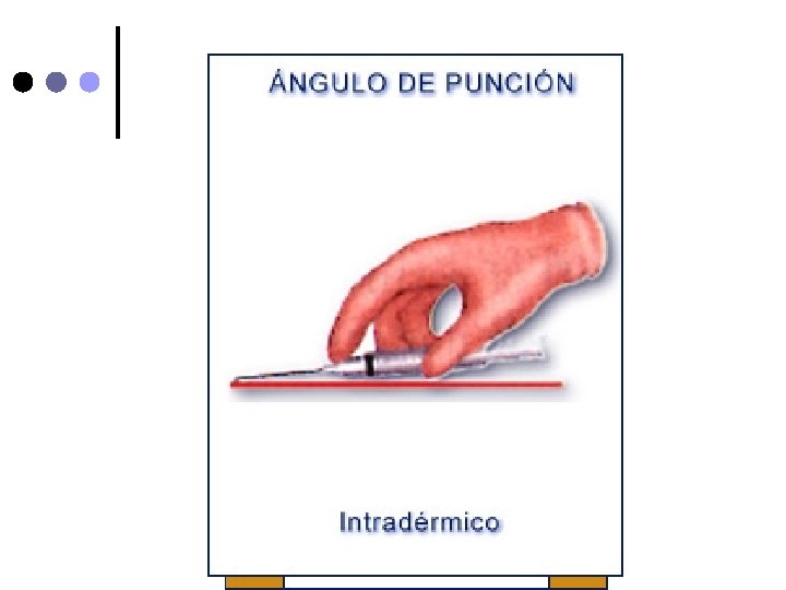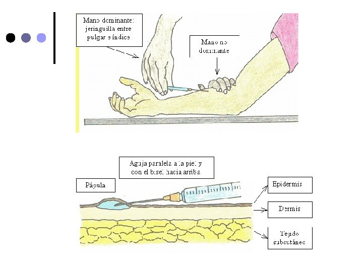 Aguja nº 26 o nº 23. ¢ Jeringa tuberculina ¢ En el sitio a puncionar haga un pliegue con la piel y tejido subcutáneo e inserte la aguija en ángulo de 45º ¢ Suelte el tejido, aspire la jeringa y asegurese que no refluya sangre e inyecte lentamente la solución (No aspirar si se administra heparina) ¢