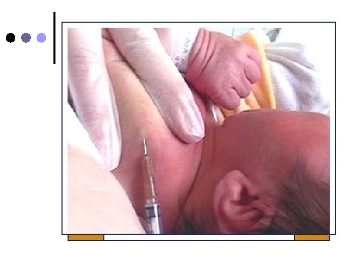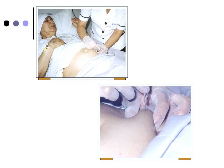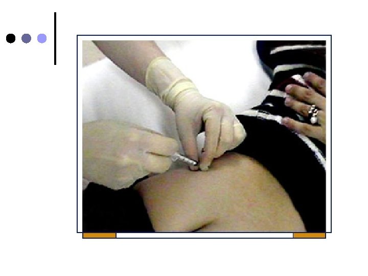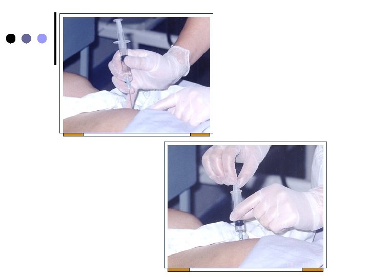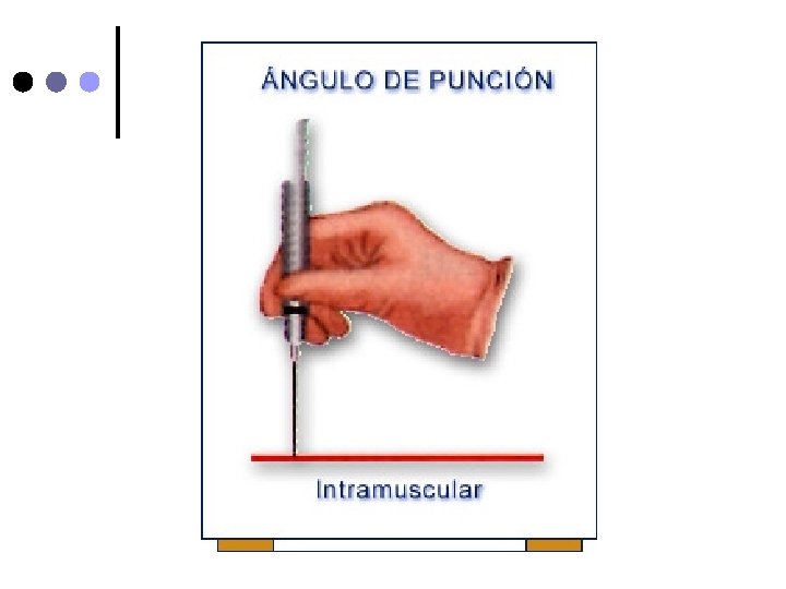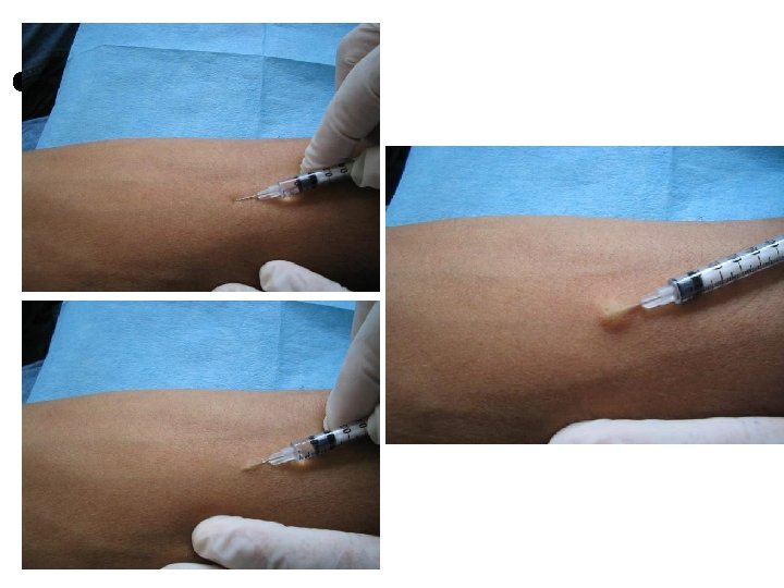 ¢ ¢ Jeringa de 3 o 5 ml. Aguja nº 21 o nº 23, para preparar aguja nº 19. Con una mano estire la piel en la zona elegida. Inserte la aguja en ángulo de 90º con un movimiento rápido y seguro Aspire la jeringa y asegurese que no refluya sangre e inyecte lentamente la solución