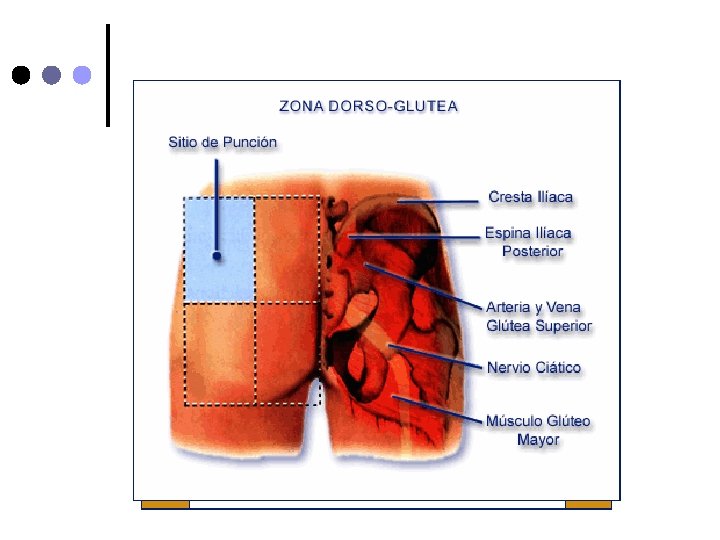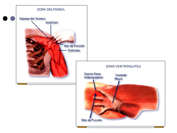 SITIOS DE PUNCION Brazo: músculo deltoide ubicado a 4 traveses de dedos bajo la articulación del hombro. ¢ Muslo : músculo vasto lateral ubicado en cara externa tercio medio. ¢ Glúteo : cuadrante superior externo. ¢