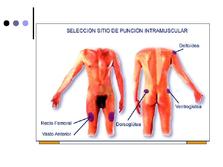 INTRAMUSCULAR: Guía de aprendizaje(40 -114) ¢ El medicamento es administrado y absorbido a través del tejido muscular. ¢ Generalmente se punciona glúteos y cara externa de brazos (deltiodes) y muslos (vasto lateral) ¢ La cantidad a inyectar es de 2 a 5 ml ¢