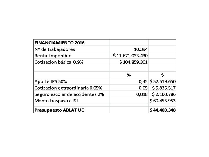 ADLAT UC CREACION: Ø Artículo 72 ley 16. 744. Ø Resolución exenta Nº 333, del 31. Octubre. 1989, de la Superintendencia de Seguridad Social. PRESUPUESTO: Ø DS Nº 43, de 2014, del Ministerio del Trabajo y Previsión Social. Ø Circular Nº 3100, del 27. Marzo. 2015, de la Superintendencia de Seguridad Social. FISCALIZACION: Ø Superintendencia de Seguridad Social Ø Ministerio de Salud