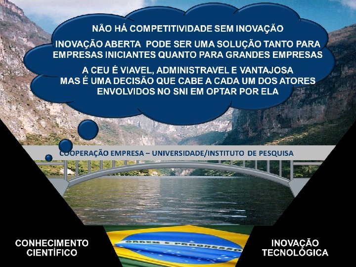 Para Concluir. . . Monitoramento de tendências de inovação Divulgação e difusão de invenções após PI Predisposição à cooperação Investimento em P&D interno e externo Capacidade de encontrar formas de utilizar/absorver a tecnologia gerada por outras organizações Capacidade de disponibilizar tecnologias para utilização por parte do meio produtivo Predisposição para o gerenciamento da inovação sob a ótica da inovação aberta “A oportunidade externa no momento certo para empresa/universidade é crucial para o sucesso” “Os programas de inovação aberta buscam incrementar as oportunidades e a aderência entre oferta e demanda em C&T&I”