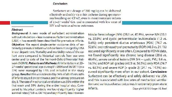Introdução Avaliada a viabilidade, eficácia e segurança do LISA em prematuros extremos. Relatado índices de mortalidade e morbidade comparado a dados de desfechos de controles históricos e os dados do Vermont-Oxford Neonatal Network (VONN)