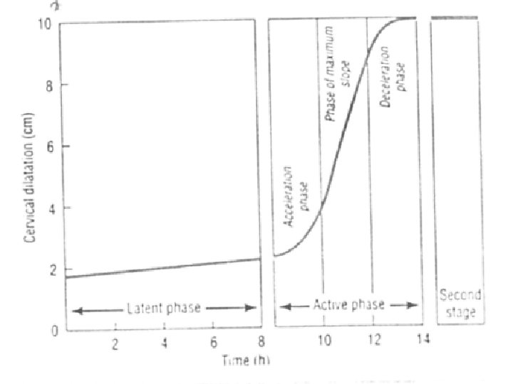 Cervical dilatation Latent phase (14 -20 h) Active phase: acceleration , phase of maximum slope , deceleration phase