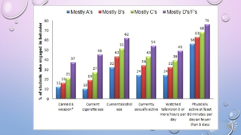 FOR STUDENTS WITH SPECIFIC GRADE POINT AVERAGES DO “A” STUDENT PARTICIPATE IN BEHAVIOR TO GREATER OR EQUAL OR LESS EXTENT THAN “D” STUDENTS? Ø PHYSICALLY ACTIVE FOR 60 MINUTES PER DAY ON LESS THAN 5 DAYS PER WEEK MORE EQUAL LESS ØWATCH TELEVISION 3 OR MORE HOURS PER DAY MORE EQUAL LESS ØCURRENTLY SEXUALLY ACTIVE MORE EQUAL LESS