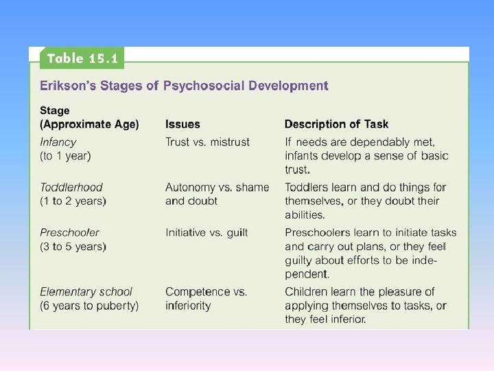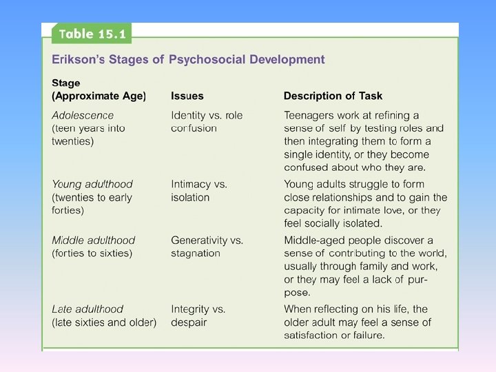 Erikson • Created an 8 -stage theory of social development • Each stage has its own psychosocial, developmental task.