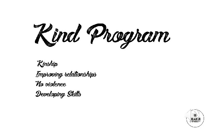 HOW KIND TRAUMA INFORMED Development of safety • safety planning for all participants • run where all feel safe • culturally sensitive and empowering • transparency of content • Clinical and cultural supervision of facilitators Deakin University CRICOS Provider Code: 00113 B Promotion of healing relationships • establishing rapport • peer support • facilitators • family inclusive • Individual and “group”/family sessions Teaching of self management and coping skills • to all family members • tailoring to learning needs and responsivity of family • strengths based • developmentally driven • individualised