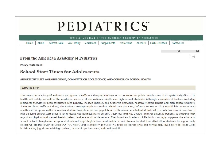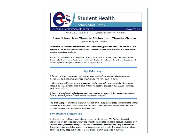 1993 resolution to educate the public on: – the need for more sleep during adolescence than during childhood – the biological shift to a later sleep pattern in adolescence – the impact of inadequate sleep on driving safety and school performance – the recommendation for schools to eliminate early starting times for adolescents (Minnesota Medical Association, mnmed. org)