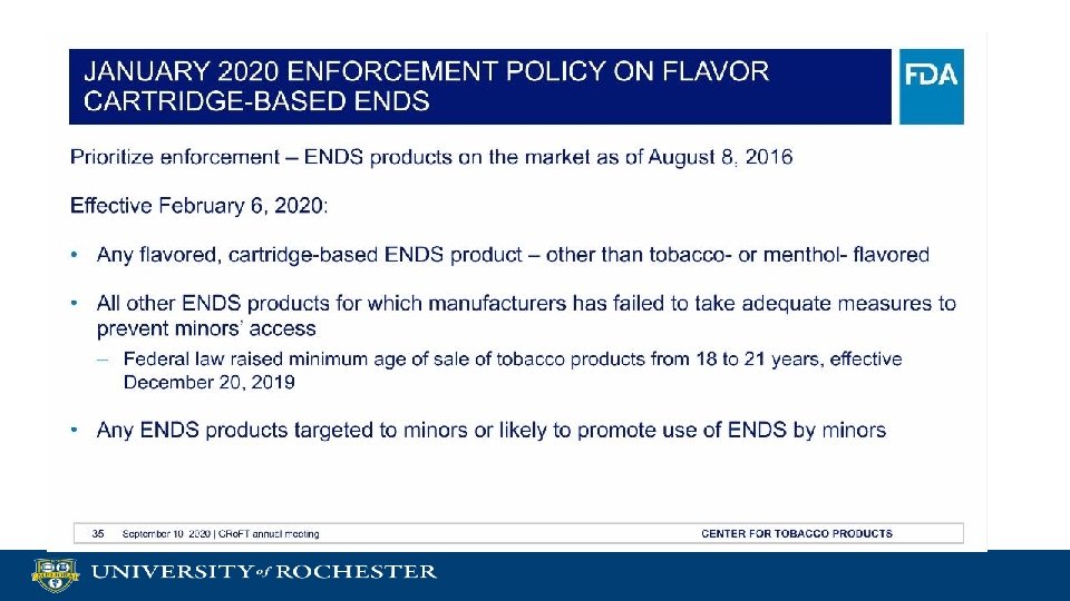 Are e-Cigarettes “Tobacco Products? ” § The answer is… a complicated, but technical, Yes § The U. S. legally defines cigarettes, cigars, smokeless tobacco, shisha, e-cigarettes, vaping devices, liquid nicotine, and smoking paraphernalia as “tobacco products” § Despite a clear and specific notation in the law that specifically states that FDA-approved cessation therapies are not tobacco products § Implementation Monitoring: ** Misinterpretation by some local pharmacies lead these businesses to wrongly include Over-the-Counter Nicotine Replacement Therapy in the “tobacco products” ban, so people looking to stop vaping and/or smoking who ages 1821 sometimes cannot access recommended pharmaceutical cessation assistance without a prescription