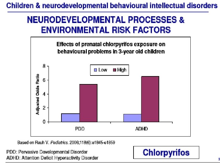 • Nearly a billion pounds of these neurotoxicants were emitted into the air and surface water, --- inhaled, absorbed or otherwise ingested through our food and water supplies. • Thirty-seven pesticides registered for use on foods are neurotoxic organophosphates. Chemical war on children – sea of neurotoxins