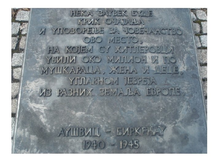 Holokaust(“potpuno spaljen” , “istrebljenje”) - Zvanični naziv za genocid u nacista nad Jevrejima, Romima, Slovenima, homoseksualcima, hemdikepiranim osobama, mentalno zaostalim osobama, antinacistima i drugima koje su nacisti smatrali nepoželjnima - U logorima je ubijeno 6 miliona jevreja , oko pola miliona roma - Koristili su otrovne gasove(ciklon B) - Aušvic-logor smrti - 27. januar 1945. - obeležava se kao Međunarodni dan sećanja na žrtve holokausta