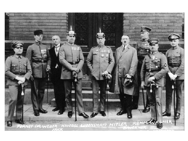 Pivnički puč - Hitler je iskoristio Ludendorfa za državni udar poznat kao Pivnički puč - 8. novembra 1923. upao na javni skup koji je vodio Kar(vladar Bavarske) i objavio da je osnovao novu vladu sa Ludendorfom - pod pretnjom oružjem, tražio je od Kara i njegovih ljudi da mu pomognu u svrgavanju vlade u Belinu - Hitler je sam započeo svoj “Marš na Belin”, ali je zaustavljen od strane vojske i policije - Osuđen je na 5 godina, ali je pusten nakon par meseci na uslovnu - Dok je bio u zatvoru izdiktirao je “Mein kampf”(Moja borba) svom zameniku Rudolfu Hesu