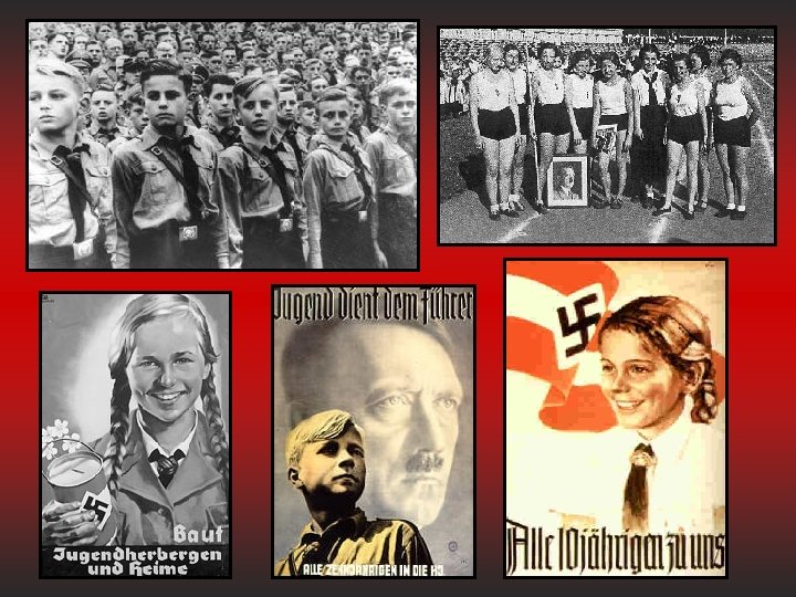 RAISING NAZI CHILDREN The Third Reich carefully subverted the German educational system to mold children into loyal Nazis School curriculum taught Nazi beliefs: history courses blamed Communists and Jews for Germany’s problems Teachers had to join the Nazi Teachers Association; those who didn’t were fired Biology courses taught the “science” of Aryan racial superiority Geography courses focused on lebensraum (living space)