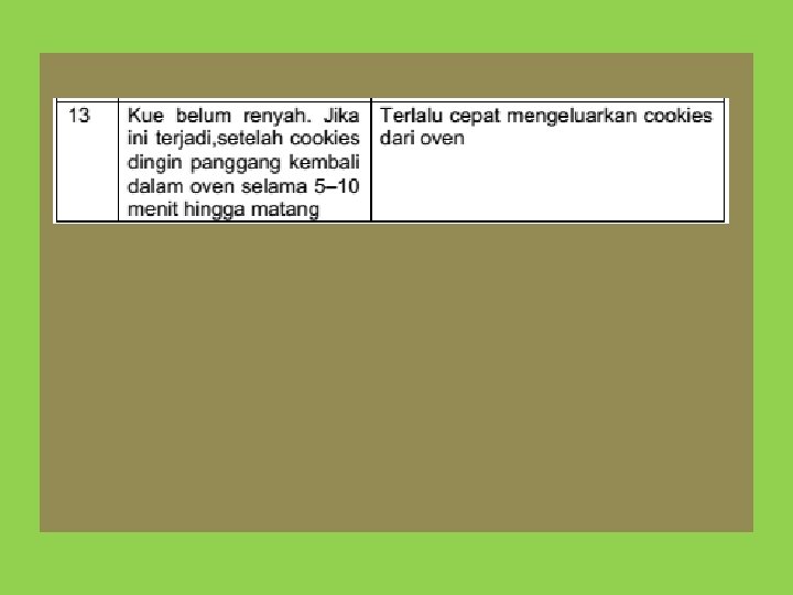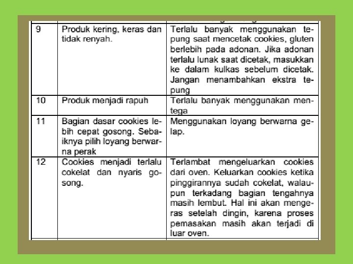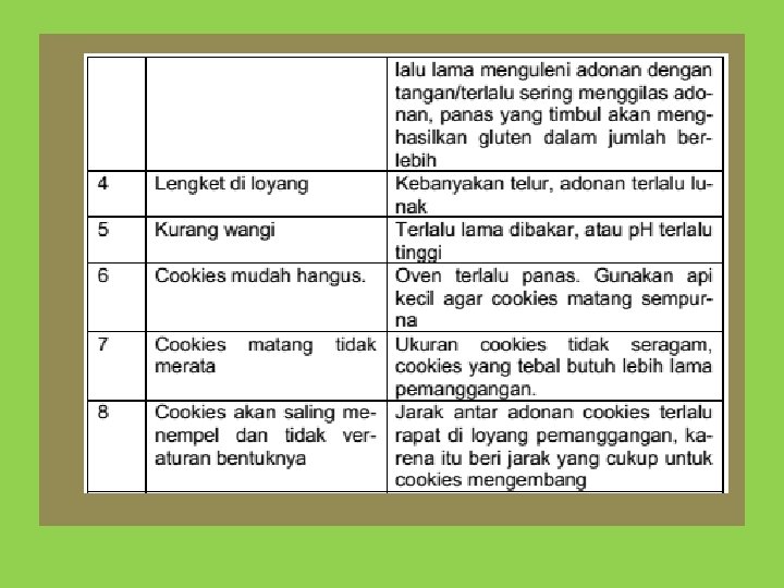 Pembakaran Cookies • Suhu pembakaran pada cookies yang umum 160 -200 o C dengan lama pembakaran 10 -15 menit, atau lebih lama. • Semakin besar cookies yang dicetak semakin lama pembakarannya dan suhu pembakaran tidak boleh terlalu panas • semakin sedikit kandungan gula dan lemak dalam adonan, suhu pemanggangan dapat dibuat lebih tinggi (177 -204 o. C).