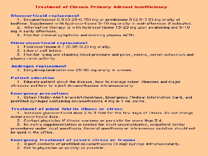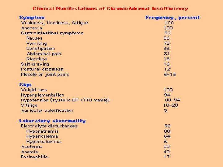 Adrenal insufficiency • First indication – increased plasma renin with nl or low serum aldo – zona glomerulosa • Next – decreasing cortisol and elevated ACTH