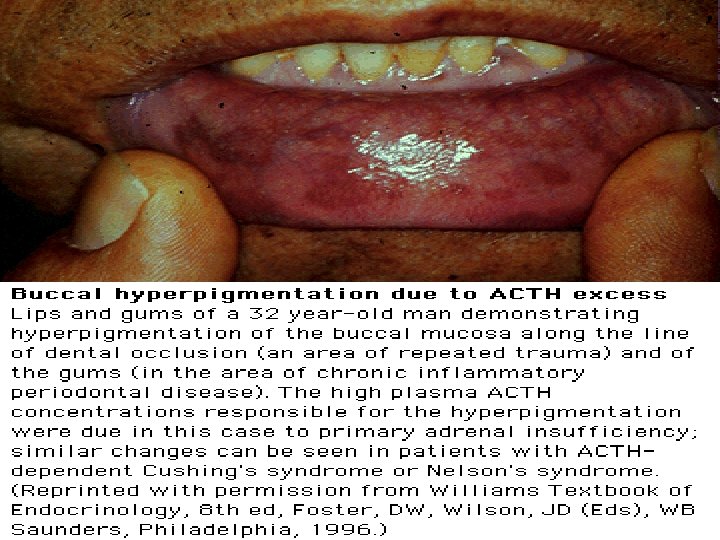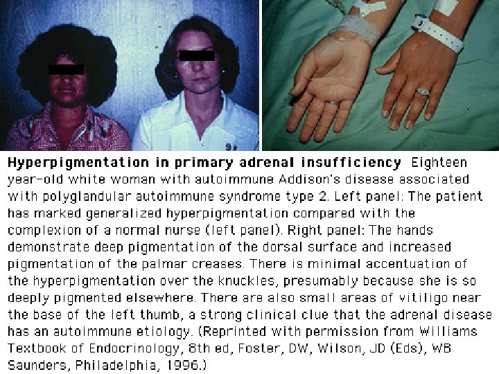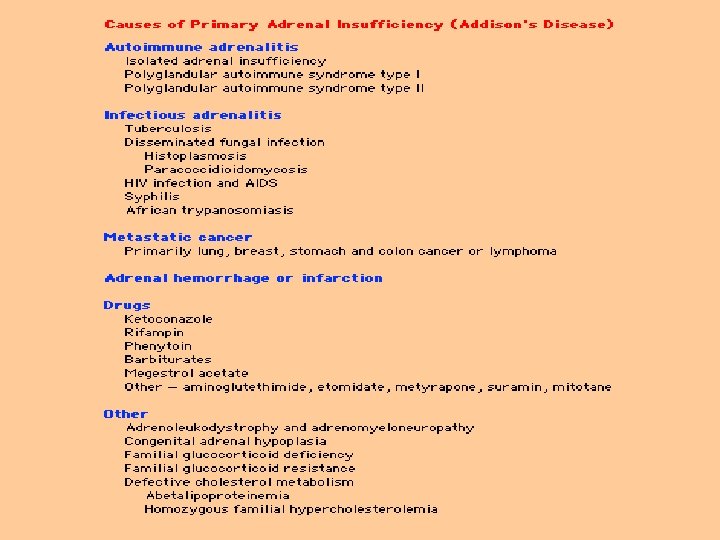 Autoimmune Adrenalitis • Humoral and cell-mediated • Antibodies to 21 -hydroxylase or other steroidogenic enzymes and all 3 zones of adrenal cortex • Polyglandular – 70% females • Isolated autoimmune – 71% males in first 2 decades, equal in 3 rd decade and 81% female subsequently