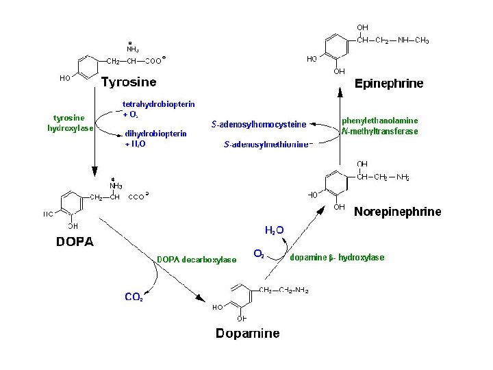 Catecholamines • • • Synth’d from L-tyrosine Dopamine, noradrenaline, adrenaline L-tyr in plasma (1 -1. 5 mg/d. L) Active transport into cells Conversion L-tyr by 4 enz’s – Compartmentalized • Adrenal medulla catecholamine output approx 80% adrenaline – BUT plasma ratio 9: 1 noradrenaline: adrenaline