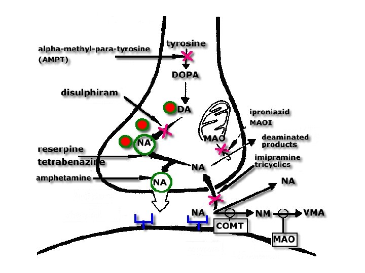 • MAO – – – In outer mitoch membr Substr’s also serotonin, histamine Oxidizes amino grp aldehydes Further ox’d by nonspecific aldehyde de. Hase Ultimate prod dihydroxymandelic acid (DOMA) • COMT – extraneuronal degradation – Uses SAM as methyl donor – Impt to circ’g catecholamines • Get final conjugation – Sulfate, glucuronate in liver, gut – Excr’n through urine